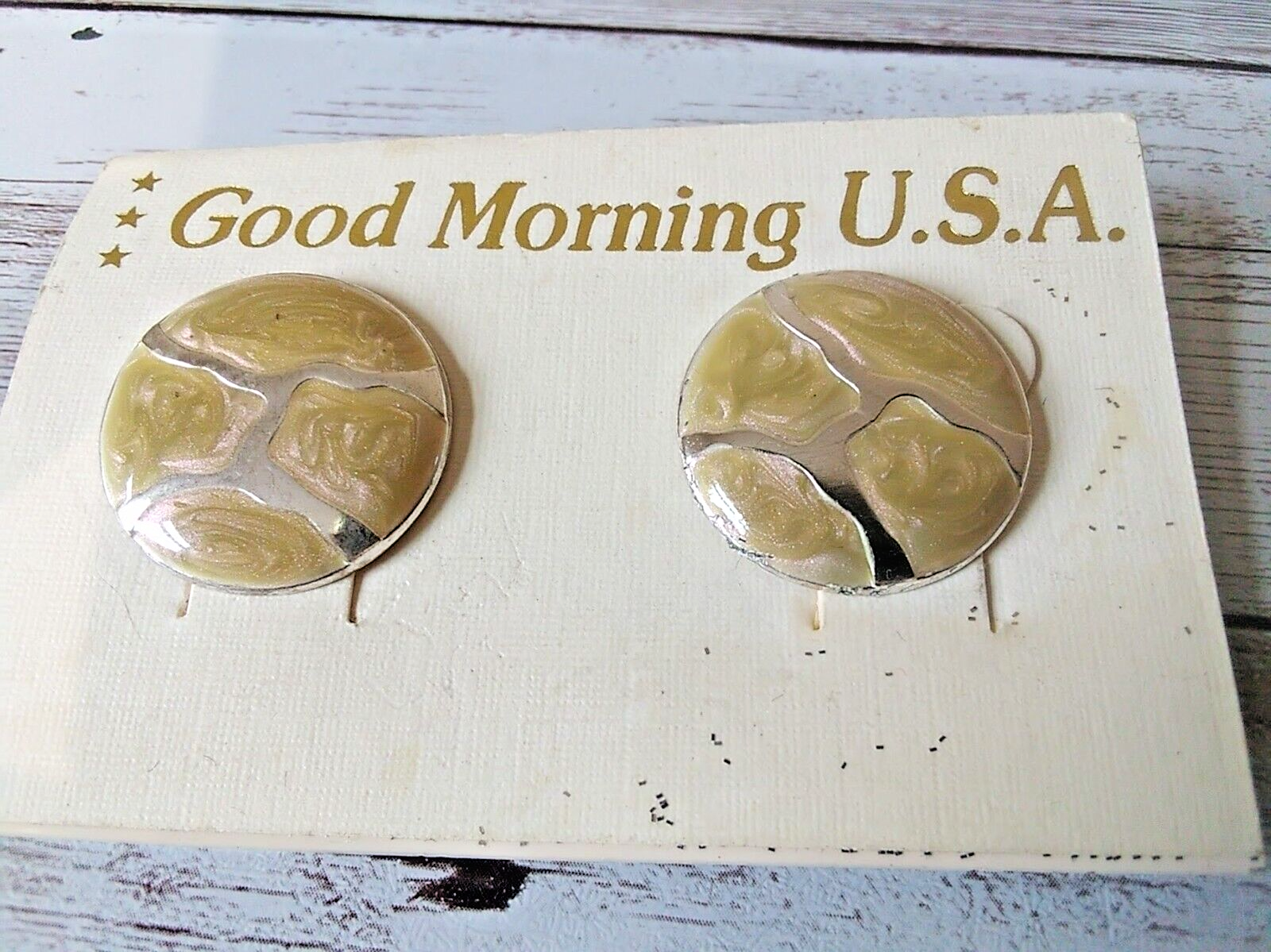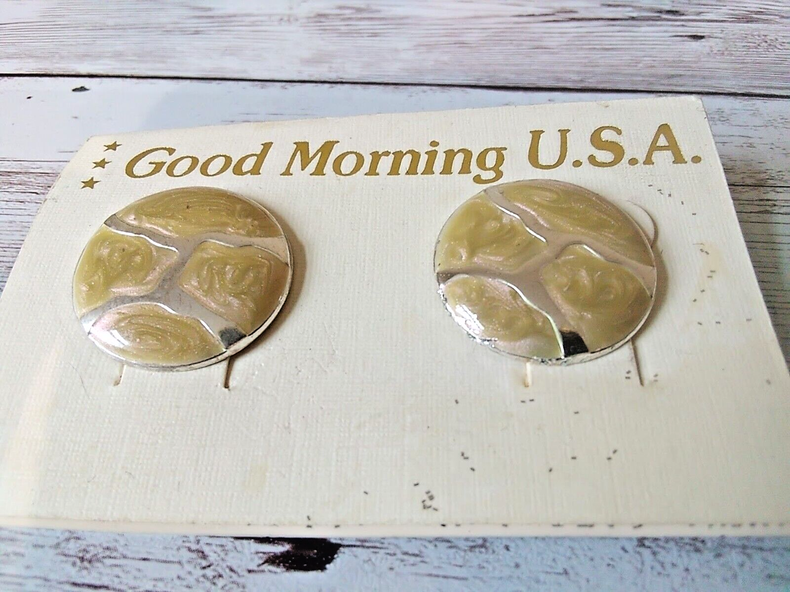 The Good Morning U.S.A. brand was a staple in various department stores during the 1980s. These lightweight earrings are hand-painted with exquisite enamel detailing, making them a rare and excellent find. Their gold-tone finish and surgical steel posts ensure both durability and comfort.